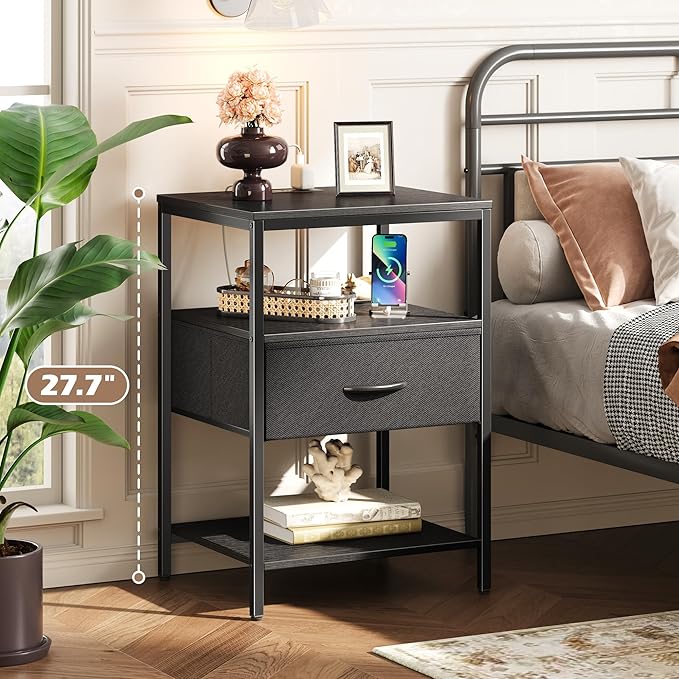 SUPERJARE Night Stand with Charger Station, 27.7 Inch Tall Nightstand with Adjustable Fabric Drawer, Bed Side Table, Fabric Drawer Dresser for Bedroom, Living Room, Black