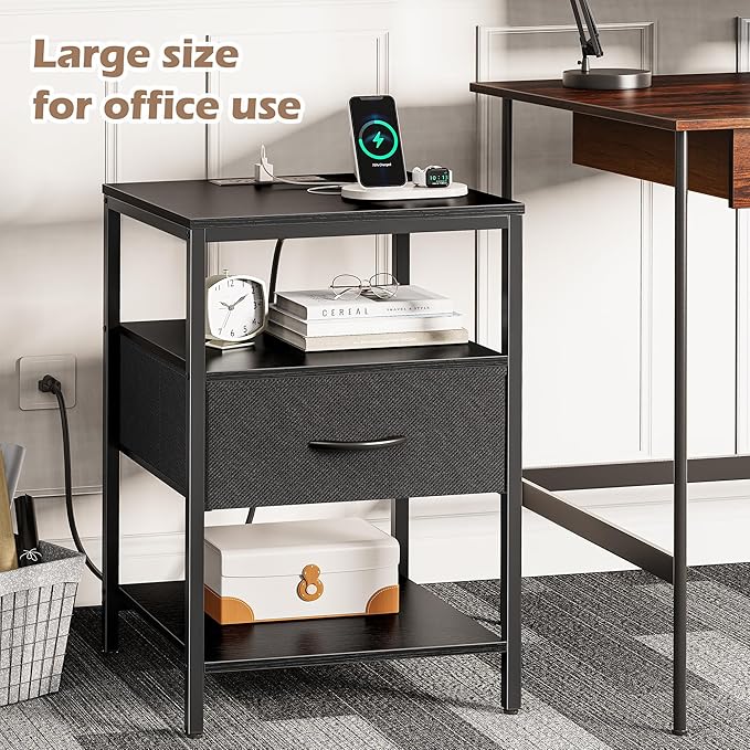 - 【Expanded Nightstand with Charging Station】 Larger and taller upgrade! This bedroom nightstand features with 1 USB port, 1 Type-C port and 2 AC outlets, perfect for your nighttime charging. The 15.7"D x 17.7"W x 27.7"H desktop and taller storage shelf tiers can hold everything you need — lamp, phone, tablet, reading books — charging and storage right beside you