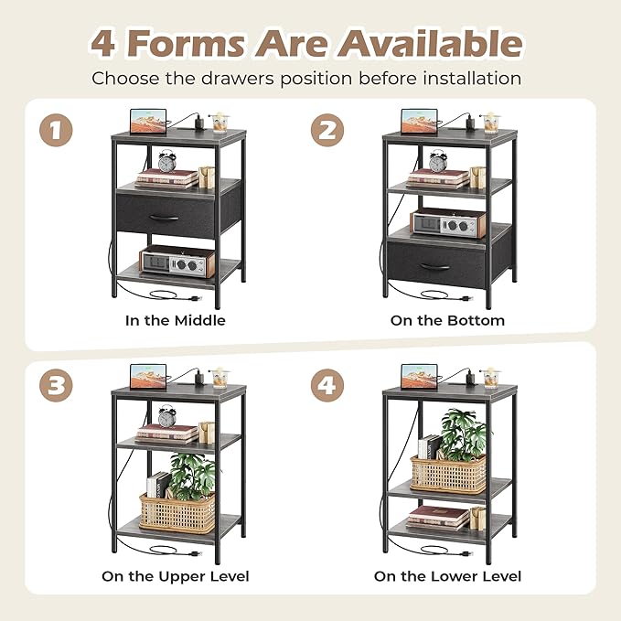 - 【Adjustable Drawer Setup】 Install your drawer in the middle or at the bottom to fit your space layout. This updated couch side table boasts 3 spacious shelves and a spacious fabric drawer, making it easy to organize everything from nighttime reads to various devices