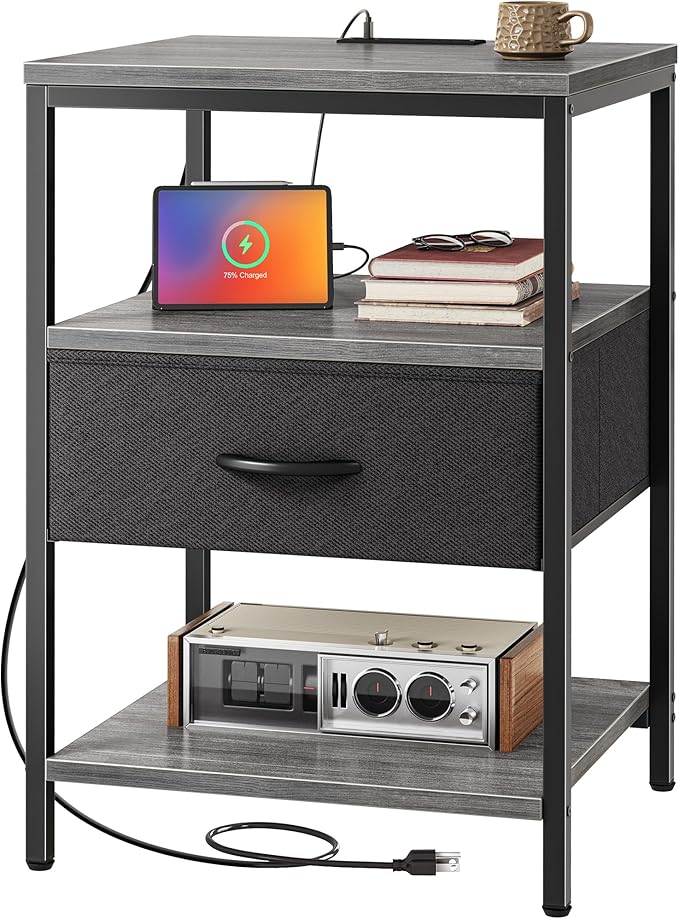 SUPERJARE Night Stand with Charger Station, 27.7 Inch Tall Nightstand with Adjustable Fabric Drawer, Bed Side Table, Fabric Drawer Dresser for Bedroom, Living Room, Charcoal Gray and Black