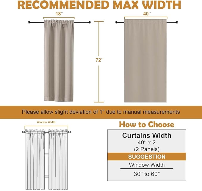 - Pair Sold: Each package includes 2 panels of blackout curtains for bedroom. Each panel measures 40"W x 72"L, with a pair measuring 80"W x 72"L. The curtains blackout have 2 hanging options (Rod pocket & Clip Style) with a 3-inch rod pocket to fit standard or decorative curtain rods. Don't worry if this blackout curtain is a few inches shorter than your window. Hang with rings & hooks for easy 3-4" height adjustment.