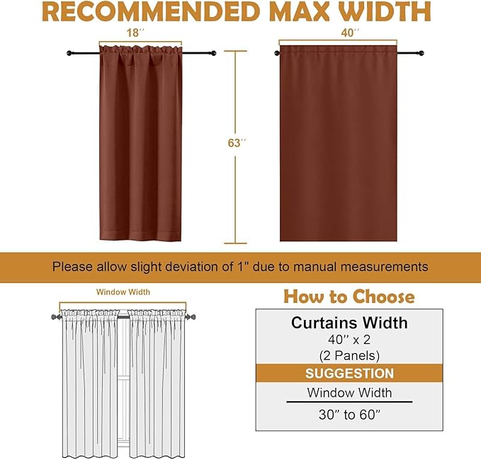 - Pair Sold: Each package includes 2 panels of short blackout curtains. Each panel measures 40"W x 63"L, with a pair measuring 80"W x 63"L. The curtains blackout have 2 hanging options (Rod pocket & Clip Style) with a 3-inch rod pocket to fit standard or decorative curtain rods. Don't worry if this blackout curtain is a few inches shorter than your window. Hang with rings & hooks for easy 3-4" height adjustment.