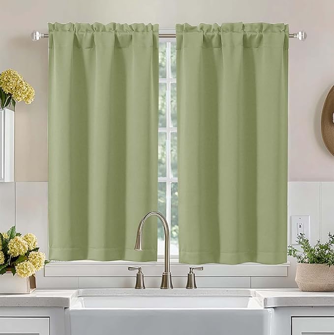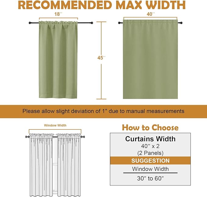 - Pair Sold: Each package includes 2 panels of short blackout curtains. Each panel measures 40"W x 45"L, with a pair measuring 80"W x 45"L. The sage green curtains blackout have 2 hanging options (Rod pocket & Clip Style) with a 3-inch rod pocket to fit standard or decorative curtain rods. Don't worry if this blackout curtain is a few inches shorter than your window. Hang with rings & hooks for easy 3-4" height adjustment.