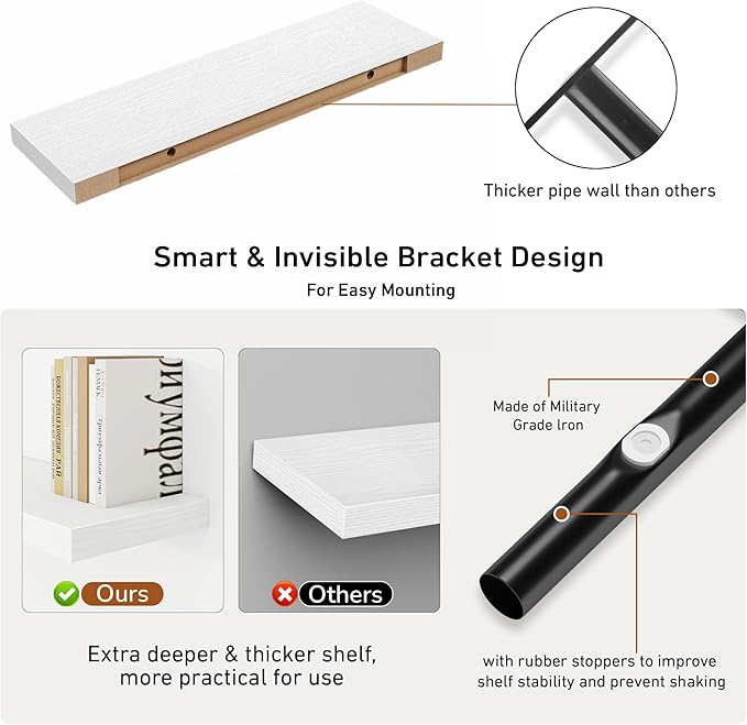 - Easy To Assemble - This floating shelves come with stainless-steel galvanized invisible brackets, toggle bolts for drywall & a simple instruction manual to help you install. The assembly of this wall shelf is very simple, only one boards and some necessary screws and other hardware, and we also have detailed instructions for you to view, you can assemble quickly. Please contact us with any questions or problems at Amazon or Fun Memories.