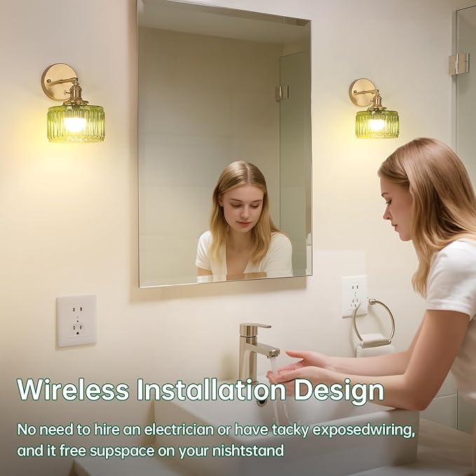 Vintage Battery Operated Wall Sconce with Green Striped Glass Lampshade 5000 mAh Rechargeable Battery Powered Wall Light with Remote Control for Bedside Bedroom Doorway