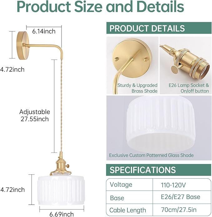 - ⭐【Product Dimensions】Arm Length: 6.14"(15.6cm); Lanpshade Dimensions: 4.72"Hx6.69"Dia.(10cmx17cm); Adjustable Chain Length: 27"(70cm). Polishing brass accessories are less prone to rusting, durable, anti-oxidation and moisture proof. INCLUDING A Bulb (G45, 6W,2700k). With a rotary switch, need Hardwired. Shenmoyl pendant light has obtained CEC certification.