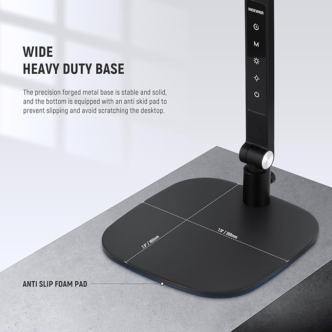 - 【Wide Heavy Duty Base】 Unlike other clamp mounted table lamps that require laborious installation and are limited to the desk edge, NEEWER small panel desk light features a large, heavy aluminum alloy base (7.5"x7.9"x0.3"/190x200x7mm) that provides stable support on any flat surface. This allows for easy and flexible movement without the need for effortful mounting and dismounting. Plus, the bottom has soft foam padding to ensure nonslip stability