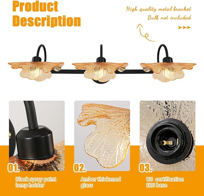 - 3 light bathroom wall sconce is made of sturdy metal lamp with matte black finish craft and high quality Thickened glass shades, The gorgeous wall light perfectly matches any style of the house, from modern to vintage, adding a more exquisite, contemporary, or vintage look to your home lighting.