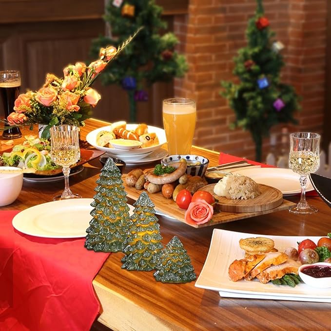 - Tabletop Holiday Decorations for Home: Our Christmas tree shaped flameless candles are hand-carved, hand-painted finish Christmas green color from natural wax and adorned with white snow on the surface. Set includes 3 pack decorative LED Christmas trees in varying heights, the large size of D4.5" x H7.5", the medium size of D4" x H6.5", the small size of D4" x H4" for an eye-catching display