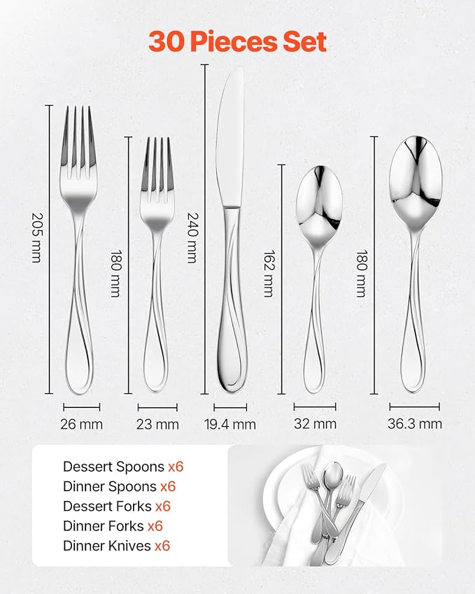 - 30-Piece Flatware Set: This silverware set includes 6 dinner forks, 6 dinner spoons, 6 dinner knives, 6 dessert forks, and 6 dessert spoons, making it an essential item for both home and restaurant use. Whether for everyday meals, dinner preparation, or parties, this flatware set is an indispensable dining tool