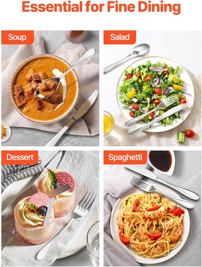 - High-Quality Stainless Steel: Made from premium 18/10 stainless steel, this tableware cutlery set is durable, corrosion-resistant, and rust-proof with excellent balance. The smooth-edged design ensures comfort during use. Dishwasher safe and perfectly weighted, it is designed for long-lasting use