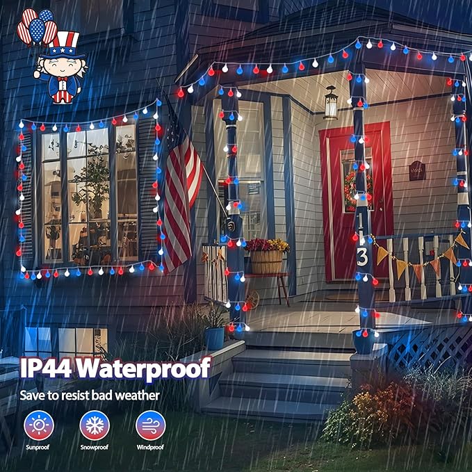 - Waterproof IP44 Design: These fourth of July lights have an IP44 waterproof rating and are designed to withstand normal weather conditions, with no need to dismantle the string during rainy days. Please note: The adapter is not waterproof and should be used outdoors with a waterproof receptacle cover