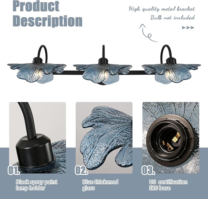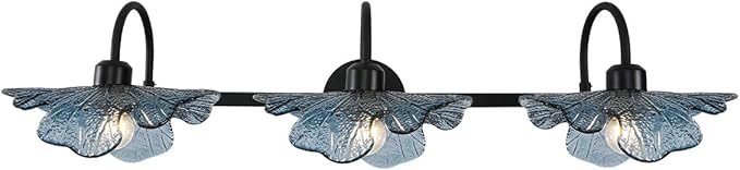 3 Light Bathroom Vanity Light Black Wall Sconce with Blue Flower Glass Shade Bathroom Wall Light Vintage Wall Sconce Art Deco Vanity Lights Over Mirror for Bedroom Hallway Living Room