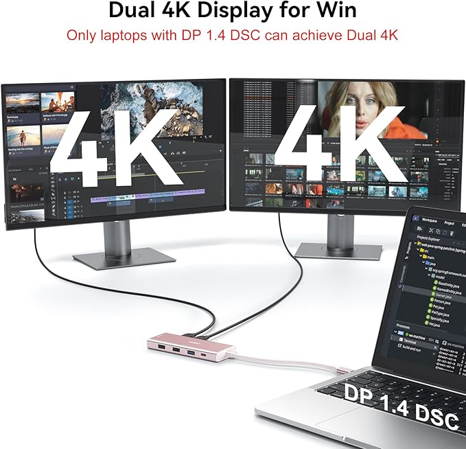 - Laptop Docking Station 4K Display Adapter: The USB C Docking Station Dual HDMI Splitter with 4 video output ports: 2 HDMI+DP+VGA. For single display, HDMI can reach 8K@30HZ or 4K@144HZ; For dual display and triple display, Can output up to 4K Dual/Triple Display videos(For laptop with DP 1.4 DSC); For quadruple display, Dual HDMI, DP, and VGA all are 1080@60Hz. Please make sure your laptop specification support DP1.4 signal output. If the VGA port is connected, it will affect the resolution of all displays up to 1080P only