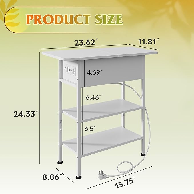 WLIVE End Table with Charging Station, Flip Top Side Table with Storage Shelf, Sofa Couch Table with USB Ports and Outlets, Narrow Bedside Table for Living Room, Bedroom ,11.81"D x 23.62"W x 24.33"H
