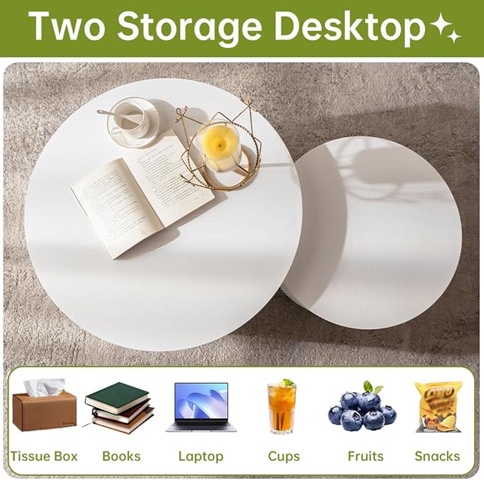 - Unique Design: This nesting coffee table set of 2 features a unique classic round design. The nesting coffee tables for living room create a harmonious and modern aesthetic with the combination of simple elegant lines and smooth curves. Additionally, the nesting tables make your living space more flexible, dynamic, and full of personality and creativity.