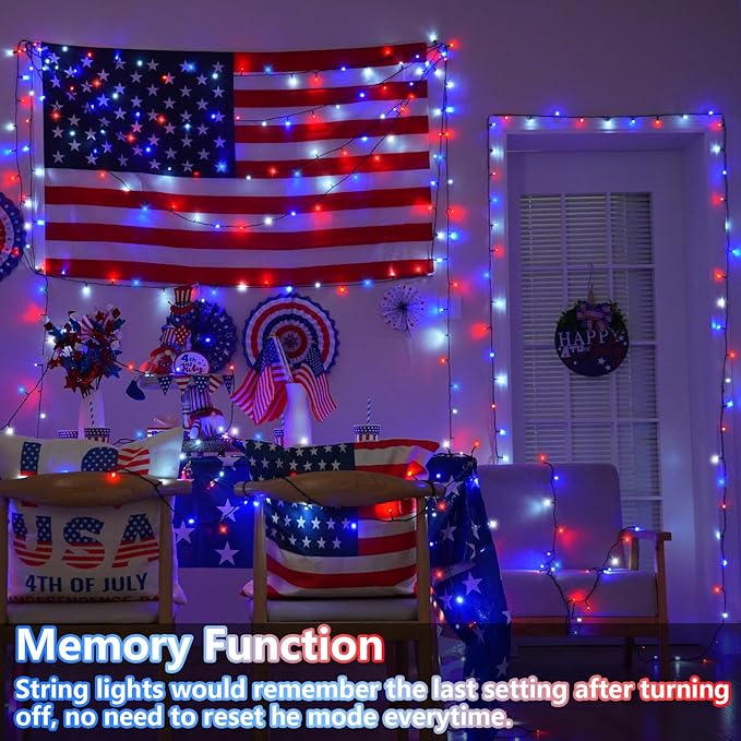 YEGUO 4th of July Decorations Red White and Blue Lights, 66ft 200 LED String Light Plug in with 8 Modes Memory for Patriotic Independence Memorial Day Decor