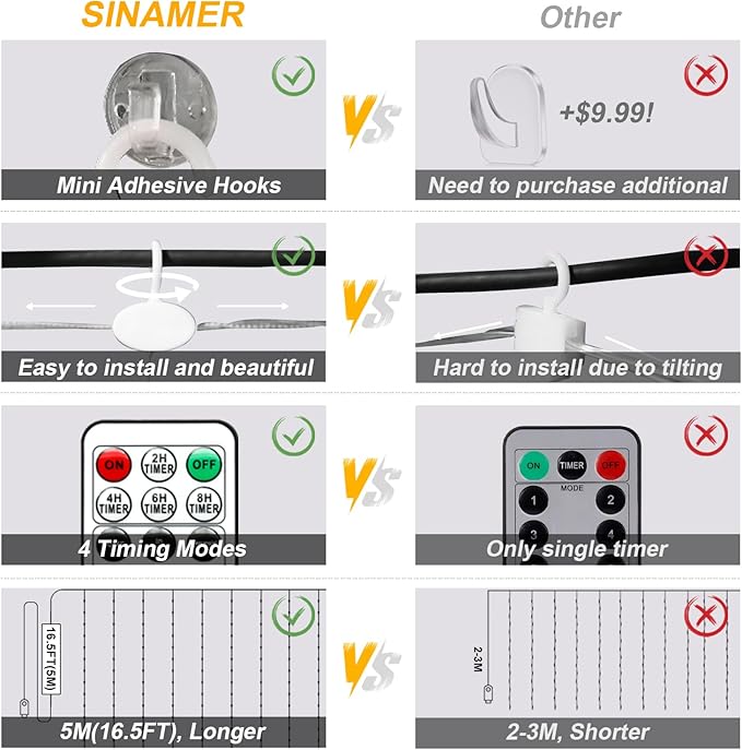 - Easy & Flexible Installation: Each strand is equipped with a 360° rotating hook for quick, hassle-free hanging at any angle; It also includes 24 extra stickie hooks for added stability and flexibility, allowing you to install the lights in more places—no tools required