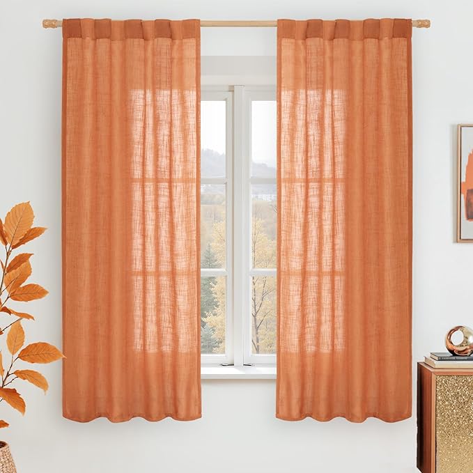 LAMIT Burnt Orange Semi Sheer Window Linen Curtains 63 Inch Length, Light Filtering Panels Back Tab and Rod Pocket Country Decor Drapes for Bedroom/Living Room, 2 Panels, 34 x 63 Inch