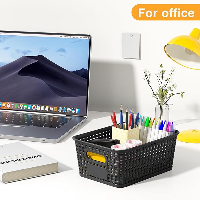 Black Plastic Storage Baskets - Pack of 8 with Labels Stackable Durable Storage Bins, Storage Containers for Organizing Desktops, Closets, Playrooms, Classrooms, Offices