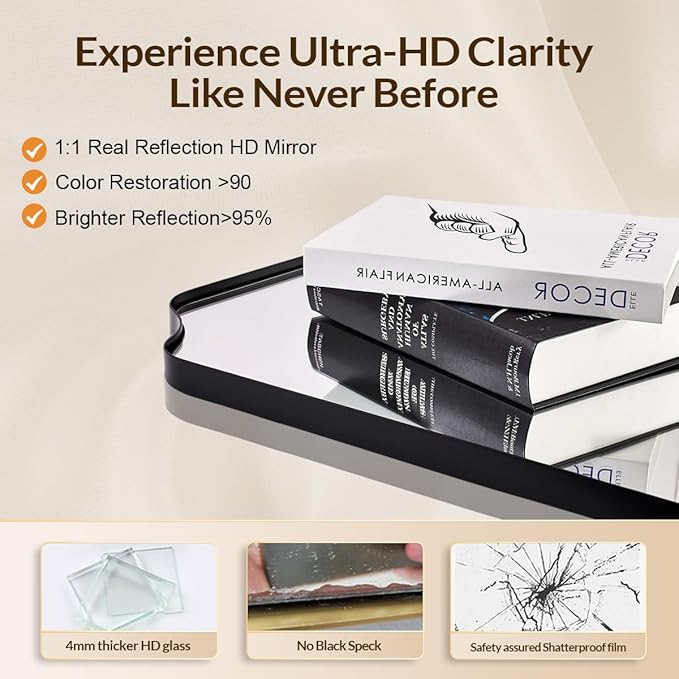 - High Definition Clarity: Experience unparalleled clarity with our mirrors; Crafted from 4mm HD glass and antioxidant coating for a lifelike image without distortion; The explosion proof film provides an added layer of safety ensures that it breaks without splashing