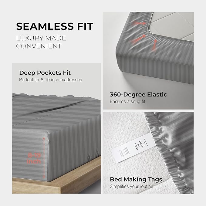 THREAD SPREAD 100% Egyptian Cotton Sheets Queen Size - 1200 Thread Count 4 PC Damask Sheet Set Egyptian Cotton, Sateen Luxury Sheet Queen Size, Soft Sateen Sheets, 17" Deep Pocket - Dark Grey Stripe