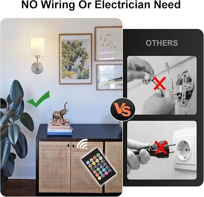- SCONCES WITH REMOTE CONTROL: The battery operated wall sconce comes with a remote control, offering a range of features such as adjustable brightness (10-100%), customizable color temperatures (1800K-amber light/3000K-warm white/4000K-neutral white/6000K-daylight), 9 RGB color options with flash and fade mode, timer settings (30/60/120 minutes), and a convenient one-touch night light function