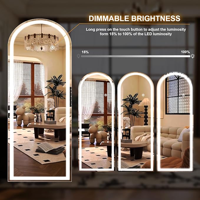 - High-Definition Reflection for a Full Body View: See every detail from head to toe with the HD tall full body mirror surface. The distortion-free vanity glass delivers crystal clarity for daily outfits, makeup, and bathroom routines. Its light up effect with three adjustable lighting modes—cool, warm, and natural—ensures perfect brightness in bedroom, living room, and home settings, so you can always step out with confidence