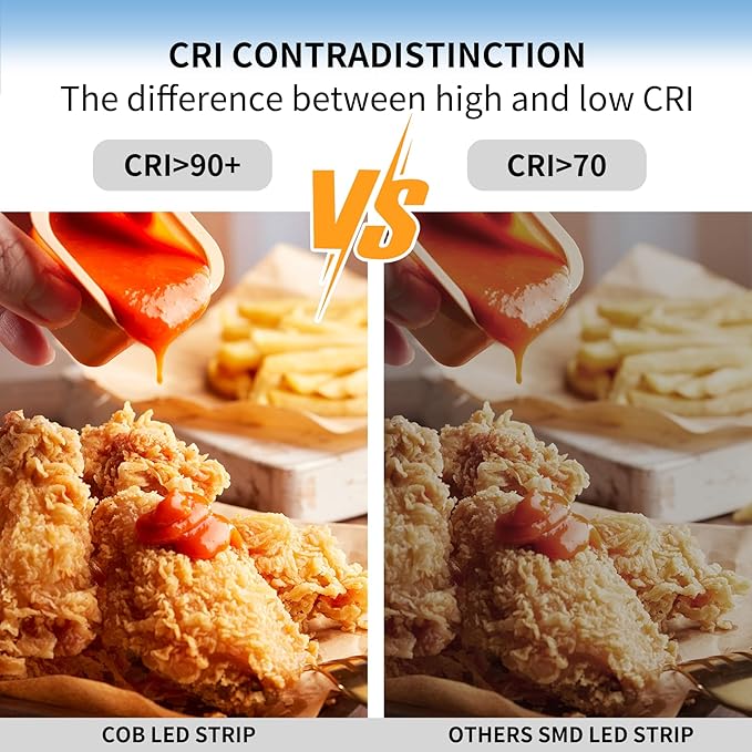 - Double PCB good heat: COB led ribbon light uses double-layer PCB board and advanced materials, making it safe and durable, Not dark spots, with 2400 LEDs on the 32.8ft. 180 degrees beam angle design for 50% wider lighting, multiple chips on board for uniform illumination. You'll enjoy an illumination color quality.
