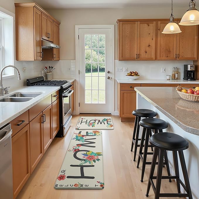 - 'Welcome to Our Home' Designed: This charming kitchen floor mat features the warm and inviting phrase "Welcome to Our Home" as its central design. The text is beautifully complemented by subtle decorative accents like delicate leaf vines and scattered floral icons. Perfect for kitchen decor and accessories collections, this mat radiates hospitality whether placed near your sink, stove, or entryway. An effortless way to enhance your kitchen and home decor with timeless style