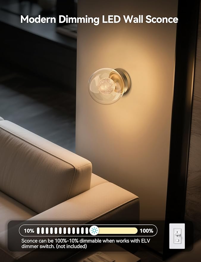 - 【Integrated LED Dimming】The spherical bathroom sconce features an integrated LED for long-lasting, energy-efficient illumination, supports dimming from 100% to 10% when works with dimmer switch (not included) to adjust the brightness from bright task lighting to a warm 3000K soft ambient glow