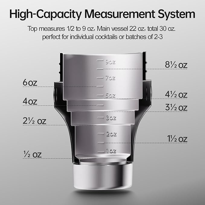 - ๐๐ซ๐๐๐ข๐ฌ๐ข๐จ๐ง ๐๐จ๐ฎ๐ซ ๐ฐ๐ข๐ญ๐ก ๐๐ฎ๐ฅ๐ญ๐ข-๐๐๐๐ฌ๐ฎ๐ซ๐ ๐๐ข๐ ๐ ๐๐ซ - Take control of your cocktail creation with our versatile integrated jigger top, offering precise measurements from delicate 1/2 oz dashes to generous 9 oz pours. The built-in strainer ensures a refined sip every time, filtering out unwanted extras.