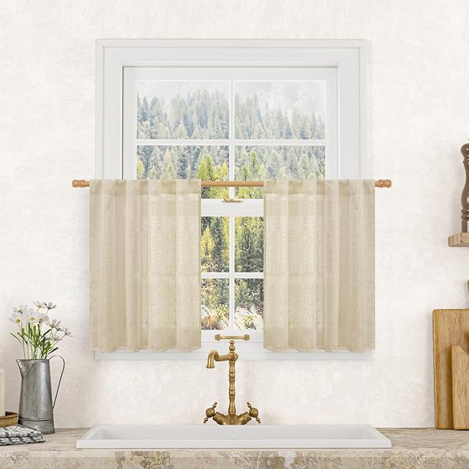 LAMIT Linen Kitchen Curtains 24 Inch Length, Semi Sheer Light Filtering Window Panels Back Tab and Rod Pocket Drapes for Basement/Small Windows, 25 x 24 Inch, 2 Panels