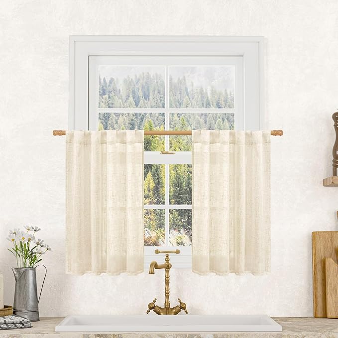 LAMIT Semi Sheer Beige Linen Curtains 36 Inch Length 2 Panels, Light Filtering Panels Back Tab and Rod Pocket Neutral Drapes for Bathroom/Kitchen/Loft Room, 25 x 36 Inch