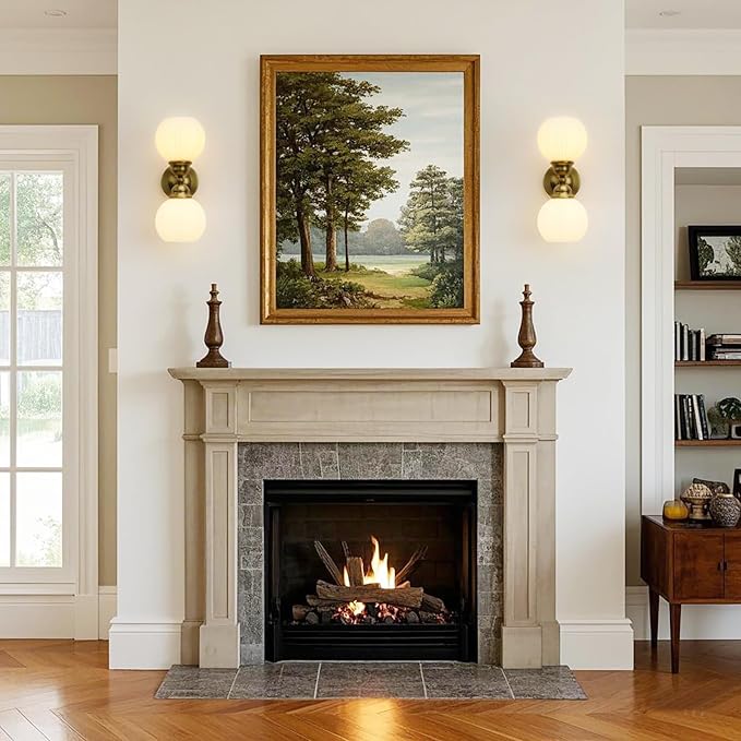 Pathson 2-Light Milk White Wall Sconces Striped Glass, Modern Bathroom Sconces Wall Vanity Light Fixtures Brass Finish, Vintage Wall Sconce Lamp for Mirror Living Room Bedroom Farmhouse Lighting