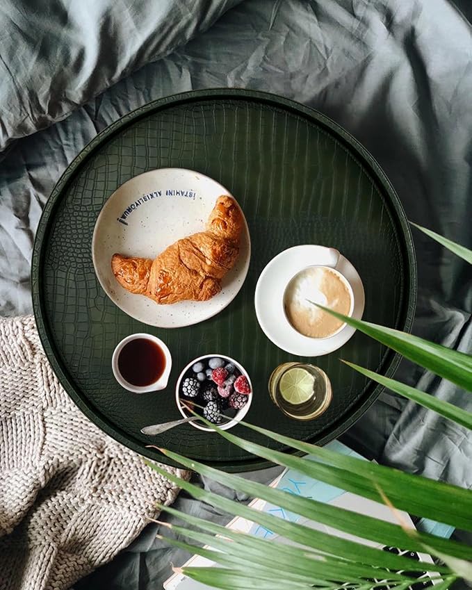 - Combining a chic round shape with antique brown croco faux leather finish, these serving trays make a stylish yet understated accent suitable for a wide range of settings. Sturdy, non-slip and lightweight material to make the wood tray use-friendly. Perfect decoration for your house.