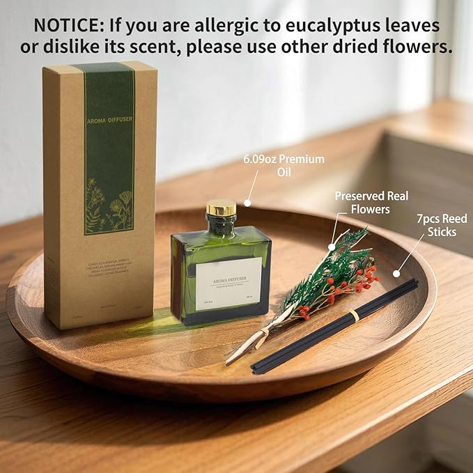 - Stylish Design: The elegant green glass bottle and natural reeds enhance any home bathroom or office decor with a touch of sophistication. Enjoy everything you need: 6.09 oz (180 ml) of non-toxic sweet berry scent fragrance liquid, 7 premium reed sticks, a stylish recyclable glass vessel, real dried flowers, and a gift box - all designed for effortless customization of your home's ambiance.