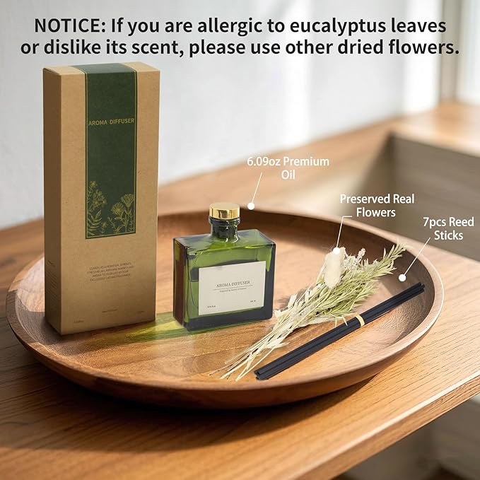 - Elegant Design: The chic glass bottle and natural reeds add a touch of elegance to any room or office setting. Our premium reed diffuser set includes real dried flowers, 6.09 oz ( 180 ml ) non-toxic EbonyRose Scent fragrance liquid, 7 reed diffuser sticks, a recyclable green glass vessel and a stylish gift box - all designed for effortless customization of your home's ambiance.