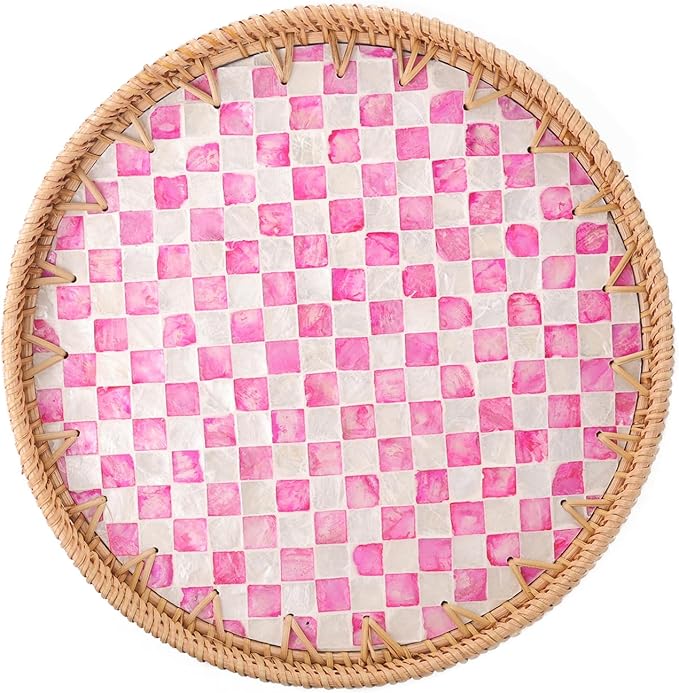 Round Rattan Tray with Mother of Pearl Inlay, Rattan Serving Tray for Coffee, Bread, Fruits, Decorative Wicker Tray for Table Decor, Home Decor, Kitchen Island Decor(Pink Checkerboard, 11.8")