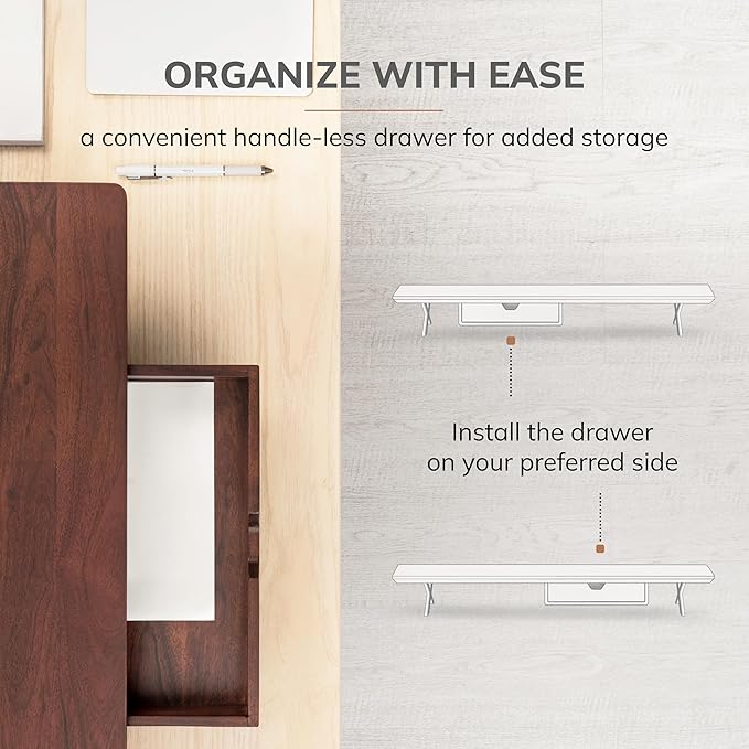 • Premium Wood Finish: Our wood monitor stand, designed for elegance, complements any decor. As a desk monitor riser, it combines functionality with aesthetic appeal, seamlessly integrating into your workspace as a desktop monitor stand.