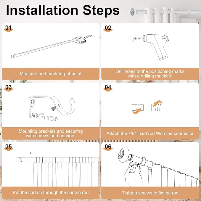 - [BOHO CURTAIN ROD SIZE SELECTION]: The OLV farmhouse curtain rod features a single side telescoping sliding construction, maximum extension length from 36 to 91 inches(3 to 7.6 feet), applicable window lengths from 30 to 84 inches(2.5 to 7 feet). This rustic curtain rod package includes 10 fixed rods, 2 adjustable telescopic rod, 4 crystal silver foil finials, 6 brackets, 14 anchors, 14 screws