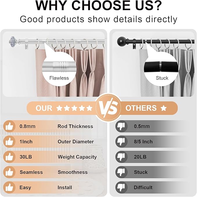 - [LENGTH ADJUSTABLE CURTAIN ROD]: Our brushed nickel curtain rod is designed with one side retractable, just adjust the length of the rod, it can be easily applied to all kinds of windows. Each 1 inch curtain rod is treated with a precision baking process, the surface is always smooth, and the grommets won't get stuck when sliding the curtains