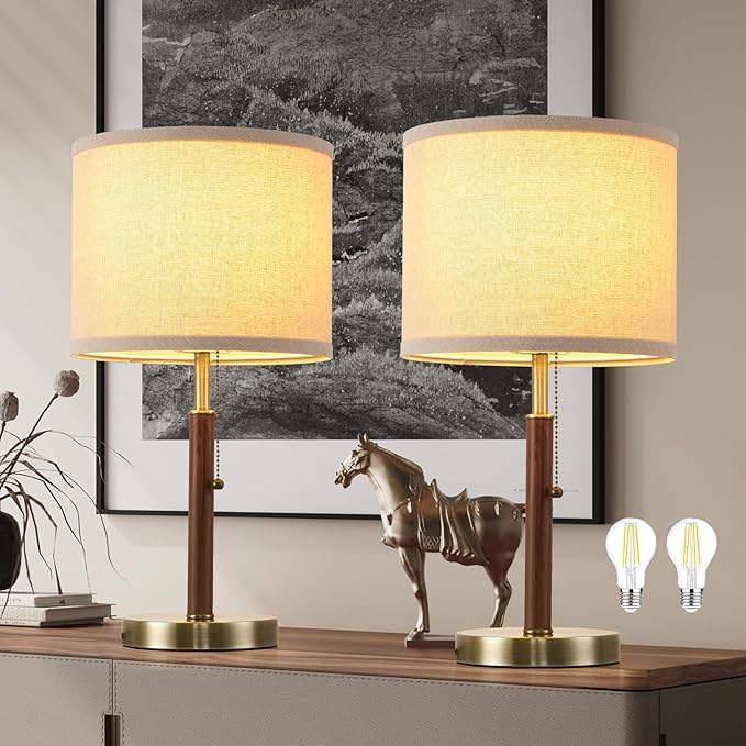 Mid Century Table Lamps Set of 2, 19.5" Modern Bedside Buffet Table Lamps with Pull Chain Switch, Antique Brass & Wood Small Nightstand Lamps for Living Room Bedroom End Table