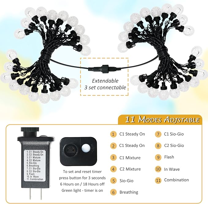 - 【Crystal Bubble Ball】 20 LED 41 FT translucent globe ball shaped string lights has a crystal clear color and contains many small bubbles can refract the beautiful light. They offer three-types lighting and 11 different modes is ideal for enhancing your home decor and bringing a warm atmosphere to your party or living space, make colourful lights brighten up your cheerful life.