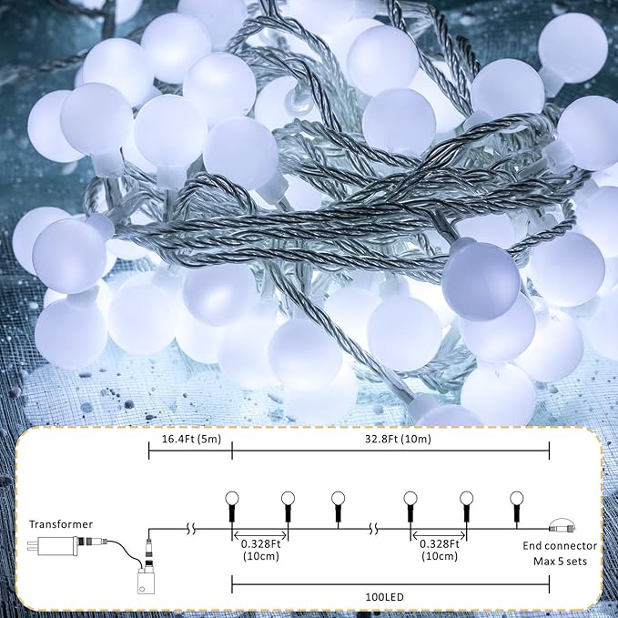 - High Quality & Extendable: These Christmas Globe lights are made from durable plastic and are powered by an adapter. The distance between each light is 4 inches, power cord length of 16.4 ft & light string length of 32.8 ft, totaling approximately 49 feet. Equipped with both male and female safe plugs, these LED string lights can be connected to form up to 5 set, making them versatile for various decorative purposes.