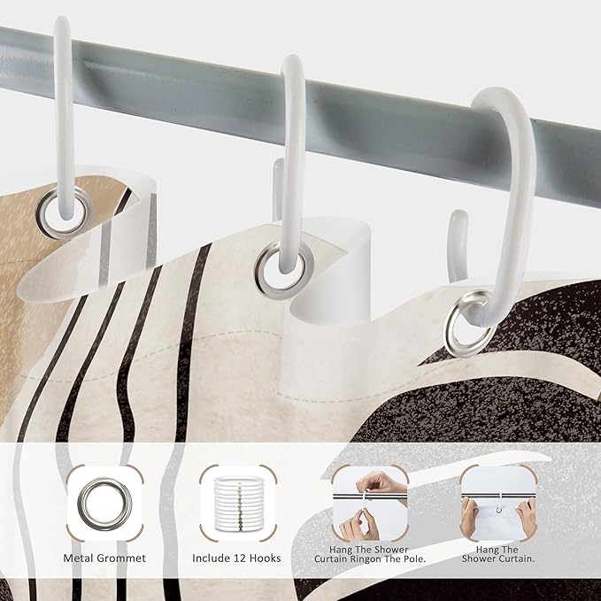 Glawry Boho Mid Century Shower Curtain Abstract Plant Tropical Palm Leaf Modern Geometric Minimalist Bathroom Black Beige Brown 72Wx78L Inches Bath Accessories Art Home Decor Fabric 12 Pack Hook