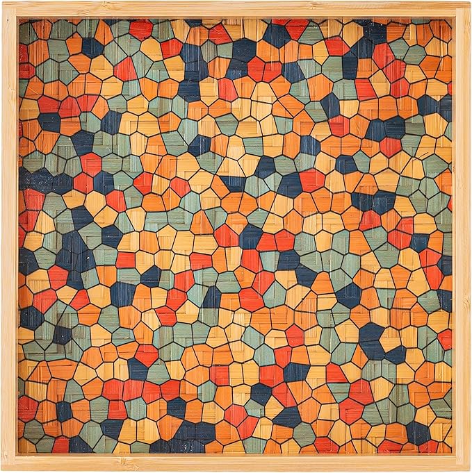 - [DIMENSION & MATERIALS] 12.2”L x 12.2”W. Made of bamboo, the tray edge is bamboo wood, the tray surface is woven by the bambo strips, backed by wood bottom. The mosaic pattern is printed on bamboo surface. The bamboo materials are natural without epoxy coating