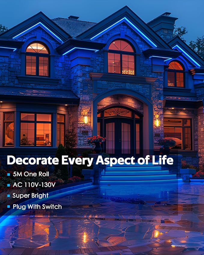 - 【Uniform Luminescence, Plug & Play】AC 110-130V Input, High Density 288 LEDs/M, Total 1440 LEDs/5M, 8W/M.16.4FT blue led strip light plug comes with an switch, plug and play, onvenient for you to use. Compared with low voltage LED strips, high voltage LED strips will not show brightness difference in the whole strip, which is ideal for super bright decorative lighting suitable for home.