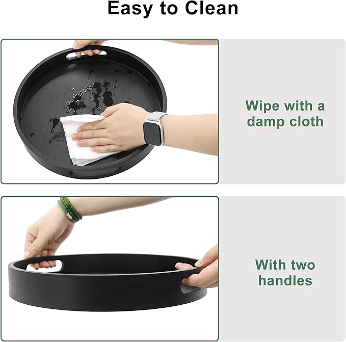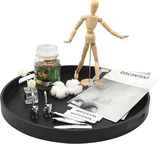 Round Decorative Tray, Extra Large Wooden Serving Tray with Handles, 11.8in Black Decorative Trays for Coffee Table,Kitchen Counter,bandejas decorativas