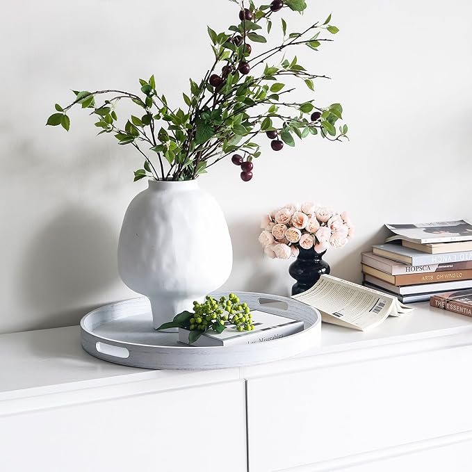 Round Decorative Tray, Extra Large Wooden Serving Tray with Handles, 11.8in White Decorative Trays for Coffee Table,Kitchen Counter,bandejas decorativas